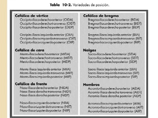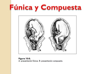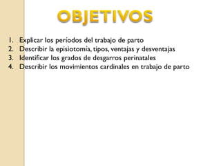 El documento resume los tres periodos del parto (dilatación, expulsión y alumbramiento), la episiotomía, los grados de desgarros perinatales, y los movimientos cardinales del parto de vértice. Explica que el trabajo de parto consiste en la dilatación y borramiento del cuello uterino, la expulsión del feto, y la expulsión de la placenta, procesos que ocurren en tres fases: latente, activa y expulsiva. Además, describe los signos de descenso de la