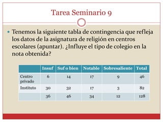 Este documento presenta los resultados de una prueba de chi cuadrado para determinar si existe una relación entre el tipo de colegio (privado o instituto) y la nota obtenida en religión. Los resultados muestran que el valor de chi cuadrado calculado (17,12) es mayor que el valor crítico teórico (7,82), por lo que se rechaza la hipótesis nula de que no hay relación y se acepta la hipótesis alternativa de que sí existe una relación entre el tipo de colegio y la nota obtenida.
