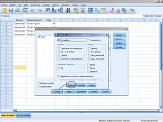 Este documento presenta un estudio en el que se administraron hipnóticos o placebos a pacientes con problemas de sueño. Se plantean las hipótesis de que no hay relación entre el tipo de medicamento y dormir bien o mal (hipótesis nula) frente a la hipótesis de que sí existe una relación. Usando una prueba de chi cuadrado, los resultados no permiten rechazar la hipótesis nula, por lo que no se encontró evidencia de que tomar hipnóticos o placebos afecte la calidad del sueño.
