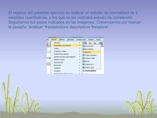 Este documento describe un estudio estadístico de dos variables cuantitativas, años de nacimiento y horas dedicadas al deporte. Se realizan pruebas de normalidad de Shapiro-Wilk y se encuentra que ambas variables siguen una distribución normal. La correlación de Pearson muestra una correlación positiva débil de 0,126 entre las variables.