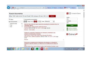 El documento describe un proceso de 3 pasos para buscar y acceder a documentos sobre la influencia del estilo de vida en el sobrepeso y la obesidad en adultos y ancianos en la base de datos Dialnet. El primer paso explica cómo acceder a la base de datos desde la página web. El segundo paso detalla la estrategia de búsqueda utilizada. El tercer paso muestra cómo descargar un artículo completo encontrado en los resultados de la búsqueda.