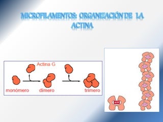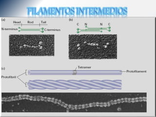 El citoesqueleto está compuesto de microtúbulos, filamentos intermedios y microfilamentos. Estas estructuras dinámicas están formadas por proteínas como la queratina, desmina, periferina y neurofilamentos. Diferentes proteínas asociadas a microtúbulos como TAU, MAP 1 y MAP 2 ayudan a regular la dinámica del citoesqueleto.
