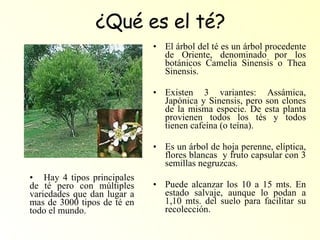 El documento proporciona información sobre el té blanco, incluyendo su historia, proceso de cosecha, beneficios para la salud, y diferentes variedades. El té blanco se obtiene de los brotes nuevos del árbol del té recogidos a mano en la primavera, que luego se secan de forma natural sin oxidación. Contiene altos niveles de antioxidantes y puede ayudar a reducir el riesgo de enfermedades cardíacas y cáncer. Algunas variedades notables son el Silver Needle y el Bai Mu Dan.
