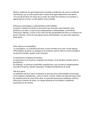 El documento discute varios problemas de salud que enfrentan los perros callejeros, incluyendo deficiencias inmunológicas que los hacen vulnerables a enfermedades como la rabia y el parvovirus, y cómo su falta de vacunación y esterilización puede afectar la salud pública al propagar enfermedades a los humanos. También señala que la esterilización mejora la calidad de vida de los perros al prevenir problemas reproductivos y de salud como cánceres.
