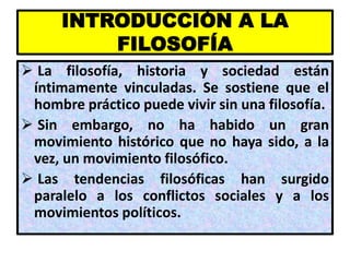 Este documento presenta una introducción al seminario de filosofía de la Universidad Peruana Los Andes. Explica que la filosofía, la historia y la sociedad están vinculadas, y que no ha habido grandes movimientos históricos que no hayan sido también movimientos filosóficos. Además, introduce algunas de las condiciones para el surgimiento de la filosofía, tanto objetivas como subjetivas, y define brevemente la filosofía y sus principales disciplinas.