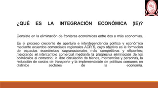 La integración económica implica la eliminación de barreras entre economías para promover cooperación y eficiencia a través de acuerdos comerciales regionales. Existen diferentes mecanismos de integración, como acuerdos preferenciales y zonas de libre comercio, que buscan facilitar el intercambio y la circulación de bienes y servicios. Proyectos como el ALCA y el Mercosur demuestran el impacto de estos acuerdos en el comercio y la política económica en América Latina.