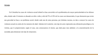 El documento describe la gravedad de la violencia sexual infantil en Colombia, donde cada 14 minutos es abusado un niño o niña. Aunque los casos son en su mayoría perpetrados por adultos masculinos, también hay agresiones de menores mayores y mujeres contra niños. Los casos de incesto son los más conocidos, pero también hay agresiones de personas desconocidas. Además de daños psicológicos, la víctima puede sufrir consecuencias físicas, sociales y familiares. La falta de denuncias y conciencia social ha permitido que estos act
