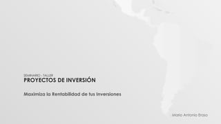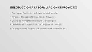 El seminario-taller se centra en la formulación y diseño de proyectos de inversión, enfatizando la importancia de una planificación adecuada para maximizar la rentabilidad. Se presentan conceptos clave como el marco lógico y la estructura de desglose de trabajos, así como técnicas para el cronograma y evaluación de proyectos. Además, se discuten estudios de viabilidad que son esenciales para la toma de decisiones sobre inversiones.