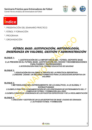 Este documento describe un seminario práctico para entrenadores de fútbol que se llevará a cabo en Málaga, España el 10 de abril de 2010. El seminario abordará temas como la justificación del fútbol base, la metodología del entrenamiento, la educación en valores a través del deporte y la creación y gestión de clubes deportivos de base. El objetivo es mejorar la preparación de los entrenadores mediante su participación activa en grupos de trabajo que analizarán cuestiones relacionadas con el fútbol base.