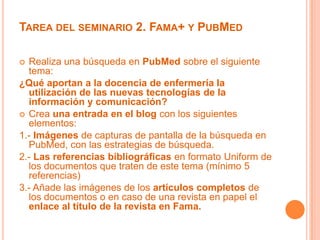 Este documento describe los pasos realizados para completar una tarea de seminario sobre el tema de cómo las nuevas tecnologías de la información y la comunicación contribuyen a la docencia de enfermería. Estos pasos incluyen realizar una búsqueda en PubMed usando términos clave, seleccionar 5 artículos relevantes, acceder a los artículos completos a través de Fama+, y generar las referencias bibliográficas de los artículos en formato Uniform.
