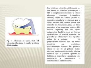 2) Existen varios tipos de retenedores como barras linguales, placoides y conectores que cumplen funciones de retención, estabilidad y transmisión de fuerzas a los dientes remanentes.
