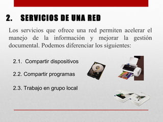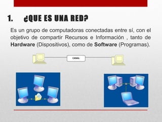 Una red es un grupo de computadoras conectadas que comparten recursos e información. Los servicios de una red incluyen compartir dispositivos, programas y trabajo en grupo. Existen diferentes tipos de redes según su tamaño, como PAN, LAN, CAN, MAN y WAN. Internet es la red de redes a nivel mundial que conecta millones de computadoras. Se originó como un proyecto militar estadounidense en 1969 llamado ARPANET y ha evolucionado para incluir el uso no militar.