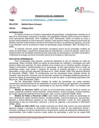 Este documento presenta información sobre los estilos de aprendizaje y modelos para determinarlos. Explica que cada persona aprende de manera única basado en su preferencia cognitiva. Describe varios modelos de estilos de aprendizaje como los de Herrmann, Felder y Silverman, Kolb, y Gardner. También propone estrategias didácticas según cada estilo y concluye que para lograr un aprendizaje significativo se debe considerar el estilo de cada estudiante.
