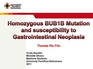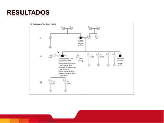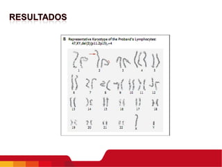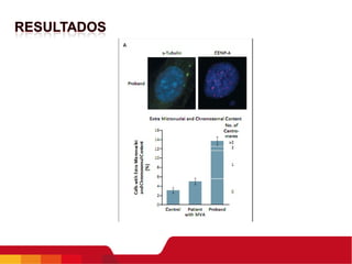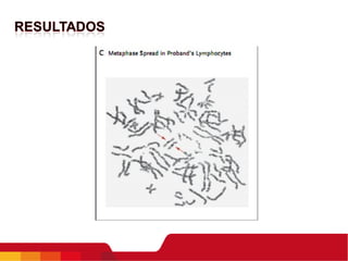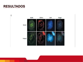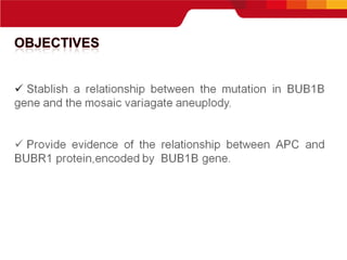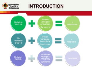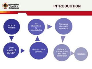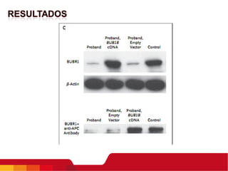 Este documento resume los resultados de investigaciones iniciales sobre una paciente con una mutación bialélica en el gen BUB1B que causa una condición similar al síndrome de aneuploidía mosaica variegada. Los análisis de citogenética en linfocitos y fibroblastos de la piel mostraron un patrón cromosómico similar al síndrome, aunque la paciente no presentaba los síntomas completos. Estudios adicionales podrían ayudar a comprender mejor cómo diferentes mutaciones en BUB1B podrían causar