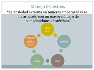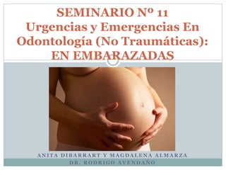 El documento presenta recomendaciones para el manejo odontológico de urgencias y emergencias no traumáticas en mujeres embarazadas. Señala que el estrés extremo puede generar complicaciones obstétricas, por lo que es importante un manejo cuidadoso que genere un ambiente cómodo. También indica que la atención odontológica es segura durante todo el embarazo, aunque los segundos trimestres son los más adecuados, y que la postergación puede implicar mayores riesgos.