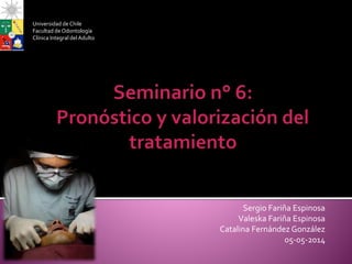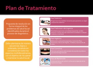 1) El documento presenta un plan de tratamiento odontológico integral para una paciente. 2) Propone exodoncia de un diente móvil y realización de prótesis parcial removible como tratamiento debido al pronóstico cuestionable del diente. 3) Considera factores como la salud del paciente, sus expectativas y su nivel socioeconómico para determinar la mejor estrategia de tratamiento.
