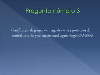 1) La evaluación del riesgo de caries es fundamental para planificar el tratamiento y control de la enfermedad, ya que la caries tiene una etiología multifactorial.