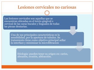 Las lesiones cervicales no cariosas se producen en el tercio cervical de los dientes y su etiología puede ser multifactorial, incluyendo caries, abrasión, erosión y abfracción. Estas lesiones suelen ser sensibles y su tratamiento busca sellar la interfaz dental y minimizar la microfiltración. La decisión de restaurar depende de factores como la sensibilidad, la integridad estructural del diente y la estética.