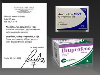 Este documento presenta el caso de una paciente de 65 años con diabetes, hipertensión e hipotiroidismo sin control hace 2 años. Se detallan los diagnósticos clínicos y la necesidad de extraer las piezas dentales 6, 7, 8, 9, 10 y 14. Se describen las acciones previas y posteriores a la cirugía considerando el estado de salud de la paciente y posibles complicaciones.