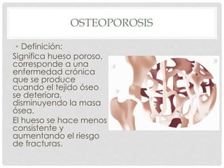 El documento resume las definiciones, etiología, fisiopatología, epidemiología, prevención, tratamiento, pronóstico y manifestaciones en salud bucal de la osteoporosis, artrosis/artritis y artritis reumatoide. La osteoporosis es una enfermedad ósea que debilita los huesos, la artrosis es el desgaste del cartílago articular y la artritis reumatoide es una enfermedad inflamatoria de las articulaciones.
