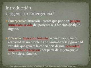 1) El documento describe diferentes tipos de urgencias odontológicas como abscesos gingivales (GUNA) y periodontales (PUNA), así como proyecciones de restos radiculares a senos maxilares.