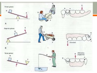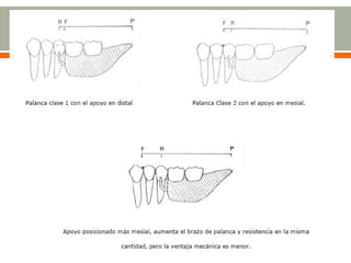 El documento discute las palancas que se pueden usar en prótesis parcial removible, sus ventajas y desventajas. En un caso de Clase I de Kennedy mandibular hasta el primer premolar presente, la palanca preferida es apoyar en el diente 4.4 y usar un conector mayor hendido o discontinuo modificado, con retenedores labrados en 4.4 y semiacker en 3.3. También describe las áreas de soporte mucoso posibles en maxilar y mandíbula.