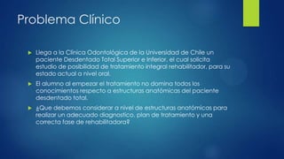 El documento describe una consulta clínica de un paciente desdentado total superior e inferior que solicita un tratamiento rehabilitador. El alumno no domina completamente la anatomía de pacientes desdentados. Realiza búsquedas en Google y PubMed para responder la pregunta si las estructuras anatómicas son importantes para la rehabilitación de pacientes desdentados totales. Encuentra más información relevante en PubMed donde hay artículos científicos con mayor nivel de evidencia.