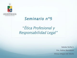 El documento presenta información sobre ética profesional y responsabilidad legal para odontólogos. Explica conceptos como lex artis, formas de culpa, principales faltas médicas, elementos jurídicos de la ficha clínica, y quiénes pueden acceder a su contenido. También analiza licencias médicas, prevención de demandas, y cómo la reforma procesal penal puede beneficiar a odontólogos demandados al otorgar mayores derechos a los imputados.