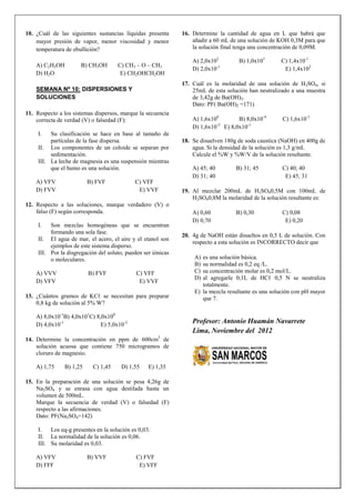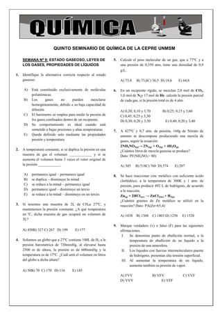 Este documento presenta 20 preguntas sobre conceptos relacionados con los estados de la materia, especialmente el estado gaseoso y las propiedades de los gases, así como sobre soluciones y sistemas dispersos. Las preguntas abarcan temas como las leyes de los gases, cálculos relacionados con presión, volumen y temperatura de gases ideales, y cálculos de concentración, normalidad y molaridad para soluciones acuosas.
