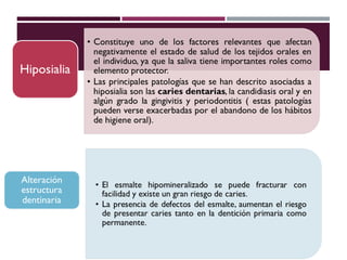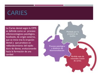 Este documento resume un seminario sobre cariología y el protocolo CAMBRA. Se define la caries dental y se describen factores como la saliva, métodos diagnósticos como ICDAS, y grupos de riesgo. Finalmente, se explican tratamientos para lesiones de caries como agentes antisépticos, pastas de flúor, geles, barnices y sellantes de fisuras. El protocolo CAMBRA clasifica el riesgo de caries para individualizar el tratamiento.
