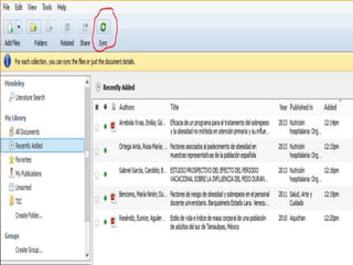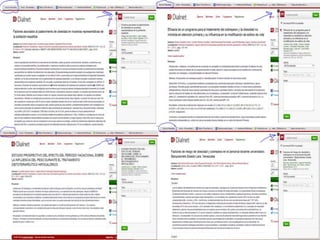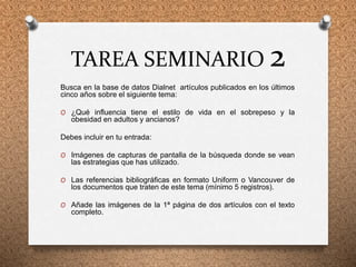 Este documento describe los pasos realizados para completar una tarea de seminario sobre la influencia del estilo de vida en el sobrepeso y la obesidad en adultos y ancianos. La autora realizó una búsqueda en la base de datos Dialnet utilizando operadores booleanos y estrategias de búsqueda avanzadas. Seleccionó 5 artículos relevantes al tema y extrajo sus referencias bibliográficas en formato Vancouver. También incluyó imágenes de la primera página de dos artículos con texto completo.