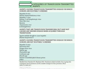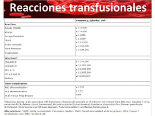 Este documento resume la historia de la transfusión sanguínea, los sistemas de grupos sanguíneos y aloantígenos, el procesamiento de componentes sanguíneos, las complicaciones agudas y retardadas de la transfusión, y las guías para la transfusión de concentrados de hematíes en diferentes situaciones clínicas.