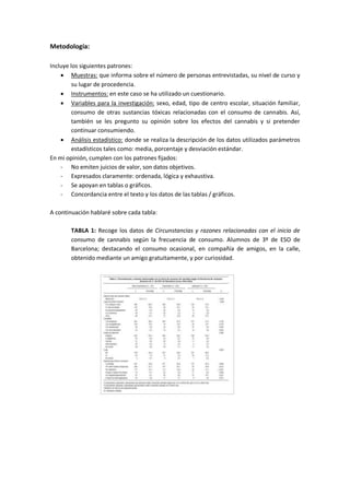 El documento resume un artículo sobre el consumo de cannabis entre estudiantes de institutos en Barcelona. Describe que la prevalencia de consumo fue del 37.5% y que la mayoría probó la droga en parques o calles obteniéndola gratis de amigos. Las expectativas sobre los efectos incluyeron relajación y reducción de tensión, aunque los efectos reportados con más frecuencia fueron pérdida de memoria, tristeza y dificultades para estudiar.