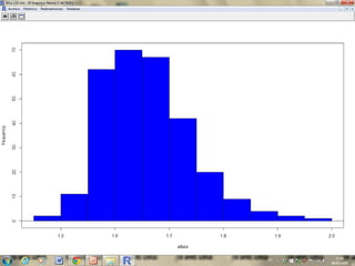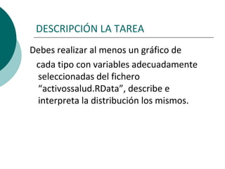 El documento describe las tareas de un seminario que incluyen la creación de diferentes tipos de gráficas (secuencial, histograma, barras, sectores y diagrama de caja) utilizando variables como peso, altura, sexo, edad y medicalización de un fichero de datos de salud. Se muestran ejemplos de cada tipo de gráfica creada con las variables correspondientes.