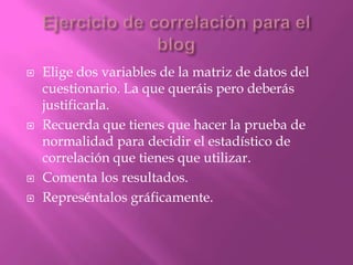 Este documento proporciona instrucciones para analizar la correlación entre dos variables seleccionadas de un cuestionario. Indica que se debe realizar una prueba de normalidad para determinar qué estadístico de correlación usar (R de Pearson o Rho de Spearman), y explica cómo interpretar los resultados y representarlos gráficamente.