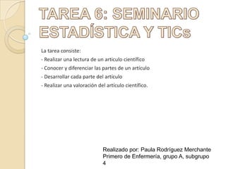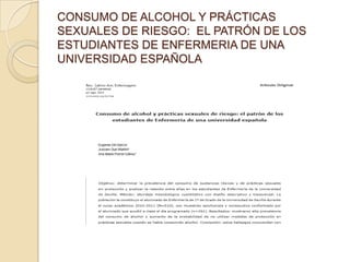 Este documento resume las partes de un artículo científico sobre el consumo de alcohol y prácticas sexuales de riesgo entre estudiantes de enfermería en una universidad española. Describe cada parte del artículo, incluido el título, resumen, introducción, metodología, discusión y conclusión. Además, evalúa el artículo como informativo y relevante para los estudiantes de enfermería.
