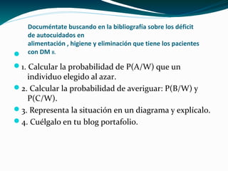 Este documento presenta tres ejercicios sobre probabilidad y estadística relacionados con los déficits de autocuidado en pacientes con diabetes mellitus tipo 2 (DM II). El primer ejercicio calcula la probabilidad de que un individuo con DM II tenga déficits alimenticios. El segundo calcula las probabilidades de déficits alimenticios y de higiene. El tercer ejercicio representa la situación en un diagrama para explicar que los tres tipos de déficits son independientes pero no mutuamente excluyentes.