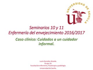 Este documento presenta un caso clínico sobre los cuidados a un cuidador informal de 75 años que cuida a su hijo de 51 años con esquizofrenia, diabetes y obesidad. Se realiza una valoración de la cuidadora que incluye sus diagnósticos de hipertensión, ictus isquémico, caídas y lumbalgia. Se desarrolla un plan de cuidados para abordar sus problemas de cansancio por el rol de cuidadora y riesgo de caídas, el cual es ejecutado y evaluado durante un mes. Finalmente, se discuten las consider