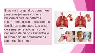 El asma puede ser causada por factores extrínsecos como alergias, intrínsecos como infecciones virales, o una combinación de ambos. Las causas incluyen antecedentes familiares, exposición a alérgenos, humo de cigarrillo, infecciones virales tempranas, uso de antibióticos en la infancia, cesáreas, estrés psicológico y contaminación. El asma también tiene una fuerte base genética, asociada con más de 100 genes relacionados principalmente con el sistema inmunológico y la inflamación.