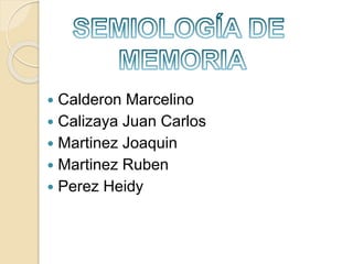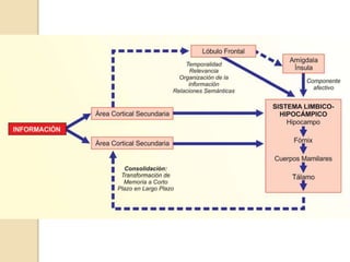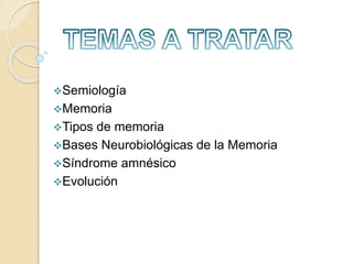 Este documento resume conceptos clave sobre la memoria y sus bases neurobiológicas. Define la semiología, los tipos de memoria como corto plazo, largo plazo, procedimental y declarativa. Explica los síndromes amnésicos como anterógrado y retrógrado, y cómo los trastornos de memoria pueden evolucionar hacia la demencia.