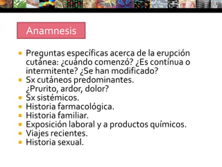 El documento detalla la semiología dermatológica, incluyendo la anamnesis y el examen físico enfocados en erupciones cutáneas, así como la clasificación y características de lesiones elementales primarias y secundarias. También se abordan lesiones de uñas, alteraciones y sus causas, diagnósticos diferenciales, y se enfatizan pruebas complementarias para evaluar diferentes patologías. Se concluye con la importancia de un examen dermatológico exhaustivo y validado para determinar diagnósticos adecuados.