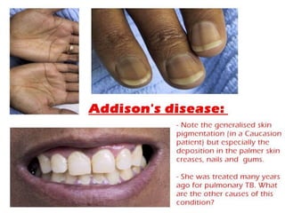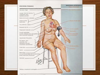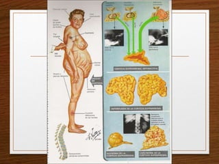 Este documento trata sobre la obesidad y su relación con el sistema endocrino. Define la obesidad mediante el índice de masa corporal y explica que está asociada con un mayor riesgo de diabetes tipo 2 y enfermedades cardiovasculares. También describe cómo medir la grasa abdominal, un factor de riesgo importante. Finalmente, menciona algunas causas endocrinológicas de obesidad y pérdida de peso, así como cambios dermatológicos relacionados con trastornos endocrinos.