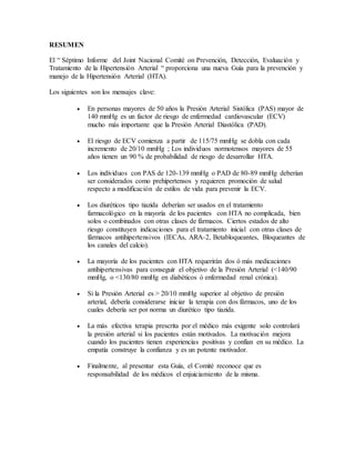 El documento resume las nuevas guías estadounidenses (JNC 8) para el tratamiento de la hipertensión arterial, publicadas 10 años después de las anteriores. Las guías se basan en la evidencia científica disponible y recomiendan el tratamiento farmacológico de la hipertensión en adultos mayores de 60 años con una presión arterial sistólica superior a 150 mmHg o diastólica superior a 90 mmHg, así como en otros grupos de riesgo. Además, establecen objetivos de presión arterial y fármacos antihip
