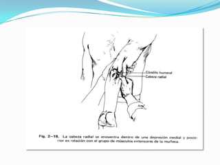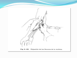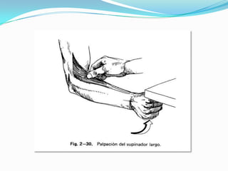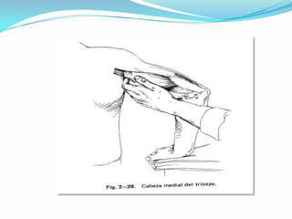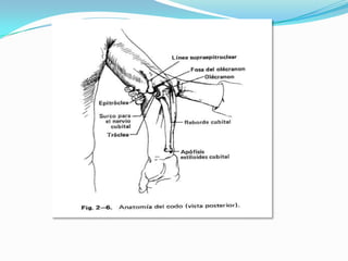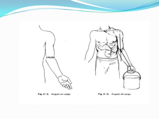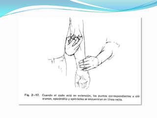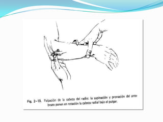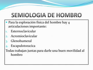 El documento describe las 4 articulaciones más importantes del hombro y cómo trabajan juntas para darle movilidad. Luego detalla la exploración física del hombro, codo y tejidos blandos circundantes, incluyendo la inspección, palpación y zonas a examinar, con énfasis en identificar anormalidades, dolor o restricciones de movimiento.