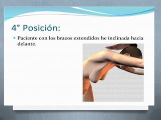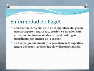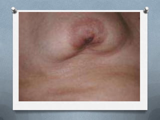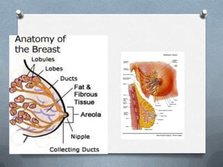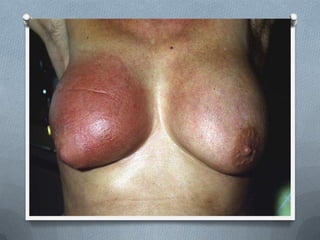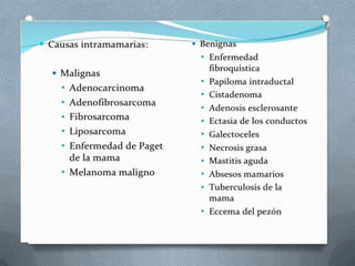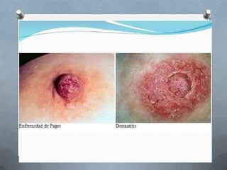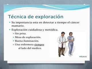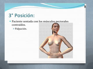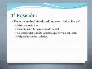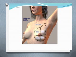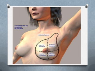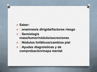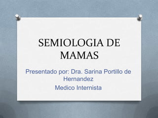 Este documento proporciona información sobre la semiología de las mamas. Describe la anatomía y fisiología de las mamas, incluido el riego sanguíneo y linfático. Explica cómo realizar un examen clínico de las mamas, incluida la inspección, palpación y evaluación de masas o nódulos. También cubre factores de riesgo para el cáncer de mama y consideraciones para la anamnesis.