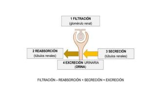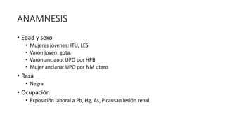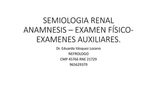 Este documento resume los aspectos clave de la semiología renal, incluyendo la anamnesis, examen físico y exámenes auxiliares. El examen físico describe la inspección, palpación de la pared abdominal y riñones, y auscultación. Los exámenes de laboratorio evalúan la función renal glomerular a través de la creatinina, urea y filtración glomerular estimada. El examen completo de orina analiza la densidad, glucosa, proteínas, hematíes, leucocitos, cilindros y cr