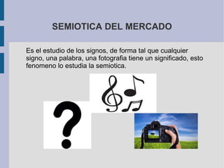 Este documento presenta una introducción a la semiótica del mercado. Explica que la semiótica es el estudio de los signos y sus significados. Los objetivos de la semiótica incluyen decodificar los códigos de las marcas y los valores culturales para comprender mejor los hábitos de compra de los consumidores. Luego describe varios tipos de semiótica, como la semiología animal, olfativa, táctil, del gusto, del gesto y paralingüística.