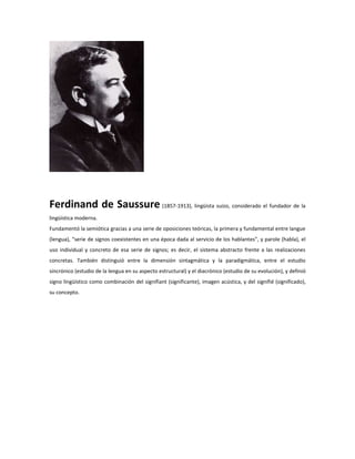 1) El documento presenta los conceptos fundamentales de la semiótica, incluyendo sus orígenes filosóficos, sus principales fundadores como Peirce y Saussure, y las diferencias entre lingüística y semiótica. 2) Describe los diferentes tipos de signos como signos naturales, signos saussureanos y signos peirceanos. 3) Explica la distinción entre una semiótica general y semióticas específicas aplicadas a diferentes sistemas de signos.