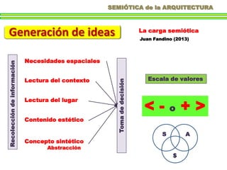 El documento describe el proceso de diseño arquitectónico, que incluye la generación de ideas a través de la identificación y clasificación de signos, códigos y lenguaje visual del contexto, la comprensión de las necesidades espaciales y el contenido estético, y la toma de decisiones para desarrollar un concepto sintético que se somete a viabilidad y dimensionamiento.