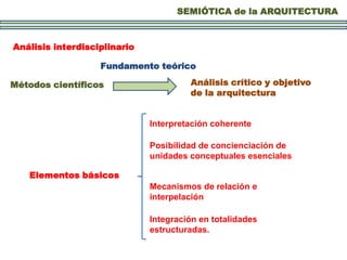El documento propone un análisis semiótico interdisciplinario de la arquitectura que incluye métodos científicos, un fundamento teórico y un análisis crítico y objetivo de los elementos básicos, interpretaciones coherentes y mecanismos de relación para integrar las unidades conceptuales esenciales en totalidades estructuradas.